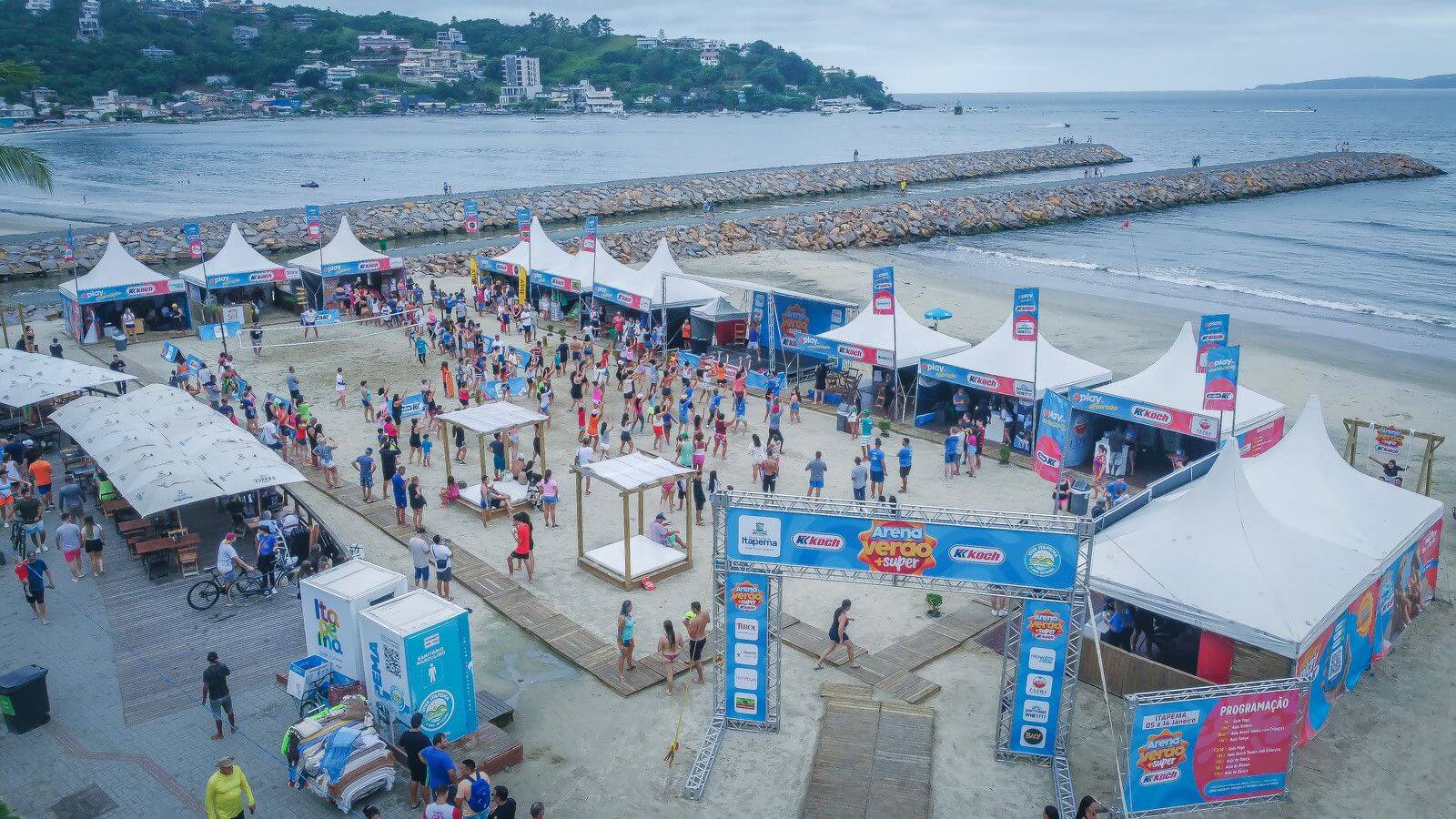 Em Itapema, a Arena Verão SuperKoch está na praia Central, ao lado da ponte e do trapiche do Suspiro. O espaço oferece quadras de beach tênis, aulas de dança e treinos funcionais. Há também degustações e ações promocionais de marcas parceiras, como Cerveja Praya, Monster, Sprite, Club Social, Três Corações, Biociclos e Dielo.